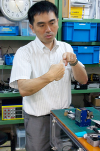 テーブルの上の部品は,古澤先生と(株)ファーストメカニカルデザインで共同開発したファイバーアライナのデモ機