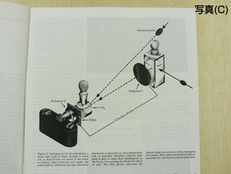 この写真は,図(写真C)のようにして撮影されたものです。ガラス瓶の向かって右側から超短パルスレーザー光(現在は光通信で通常使われる程度の短パルス)を当て,ガラス瓶の中で散乱している光を超短パルスレーザーと同期させた別の赤外線パルスレーザーをこの非線形光学セル(超高速シャッター)により,直交ニコルの状態にある2つのポラライザーの間で偏光が回転することで光が少し通るようになり,その結果,ガラス瓶の中に光が飛んでいる状態の撮影(写真A)に成功したのです。学生にも「通常私たちは光で物体を見ていますが,この写真では光自体の飛んでいる姿が目にできるのです」と説明しています。このガラス瓶の表面にある0,5,10の目盛りの単位はmmで,この光の幅は約10~(1cm),つまり数10psのパルスです。現在は,通常の光通信で使われるパルス幅ですが,当時はかなり速いパルスでした。その意味でも,この写真は画期的であったといえます。実は,後にこの写真を撮影した研究者とは思いがけず出会うことになるのです。