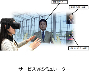 2つ目として,実訓練ではちゃんとやっているかを見るために,マンツーマンでやらなければならず人手がかかります。VRならインタラクティブなことをやろうとしたときにも,HMD(ヘッドマウンテッドディスプレイ)をかけてコンピューターを介して行うので,何がどう動いたかを全部コンピューターで記録できます。窓口サービスの場合には,お客様とちゃんと目を合わせながら対応しているか,視線がどこを向いているかが重要になります。HMDはディスプレイだと思われていることがありますが,最近のHMDはセンサーの塊です。ヘッドトラッキングセンサーがついていて,頭をどう動かしたかがわかりますし,アイトラッカーで目がどのように動いているかもわかります。最近は,顔の緊張や脈拍などもわかります。このセンサーを用いて集められたデータを分析することによって,訓練の可能性がいろいろ広がっているのです。