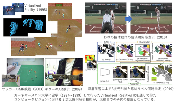 聞き手:現在,中心にされていらっしゃるご研究についてお話いただけますでしょうか。斎藤:画像は,例えば640×480個のあくまでも単なる明るさの分布ですが,1990年代にはそれだけのものから画像に映っているものを3次元的にセンシングするという研究テーマが流行っていました。そのような分野で世界のトップを走っていたのが,カーネギーメロン大学の金出武雄先生の研究室でした。論文では知っていましたが,1997年にそのカーネギーメロン大学に留学するチャンスを得ました。当時,研究室ではカメラを部屋中に50台設置して,その中で人が踊っているといった状況をすべて3次元的にキャプチャーするようなことをしていました。