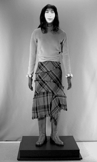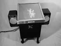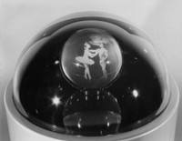 ![]() 図1 「ミニライブシアター」テーブル上に動画空間映像が立ち上がって表示される展示映像装置 | ![]() 図2 「水晶球ディスプレイ」ムクの透明球体の中に動画映像が表示される展示映像装置 | ![]() 図3 「Chatty」映像装置を組み込んだ「話すマネキン」 |