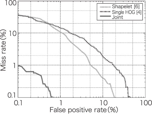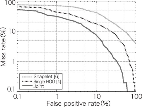 図8 人検出と車両検出におけるJoint HOGの効果。DET(Detection Error Tradeoff)による評価。