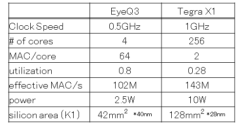 表2.Mobieye EyeQ3とNvidia Tegra X1の比較