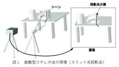 もう1つは能動的ステレオ法と呼ばれる手法で,ステレオ法の2台のカメラのうち一方を,光を射出する装置に置き換えたものである.この場合,一方から光が放たれる方位と,それにより照らされた点を他方から観察したときの方位の関係から対象物体の形状が求められる(図1).