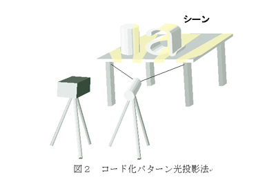 より複雑なパターン光を設計することで,1枚のパターン光照射のみで形状を求めようとする手法も古くから数多く提案されている.この手法は受動型ステレオ法と同様に動きのある物体の計測に強く,近年では Microsoft 社の Kinect (初代,2010年)に用いられて脚光を浴びた.撮影された画像上の輝度パターンを投影光上のパターンと比べることで距離を求めるため,他の能動型ステレオ法では可能な細かな凹凸の計測は難しく,形を精密に求めるよりは,人体動作の認識など抽象度の高い情報を得るために用いられることが多い. <次ページへ続く>